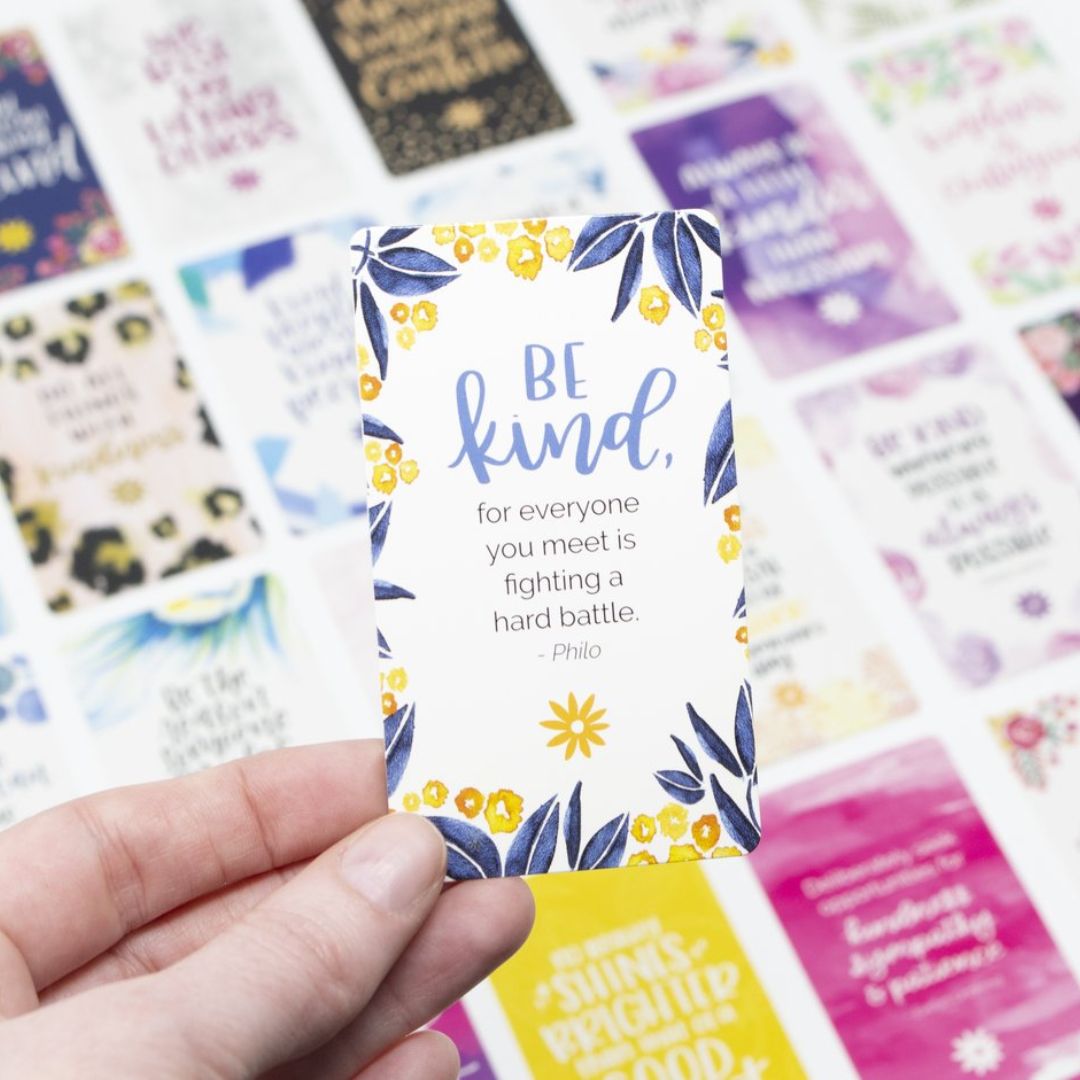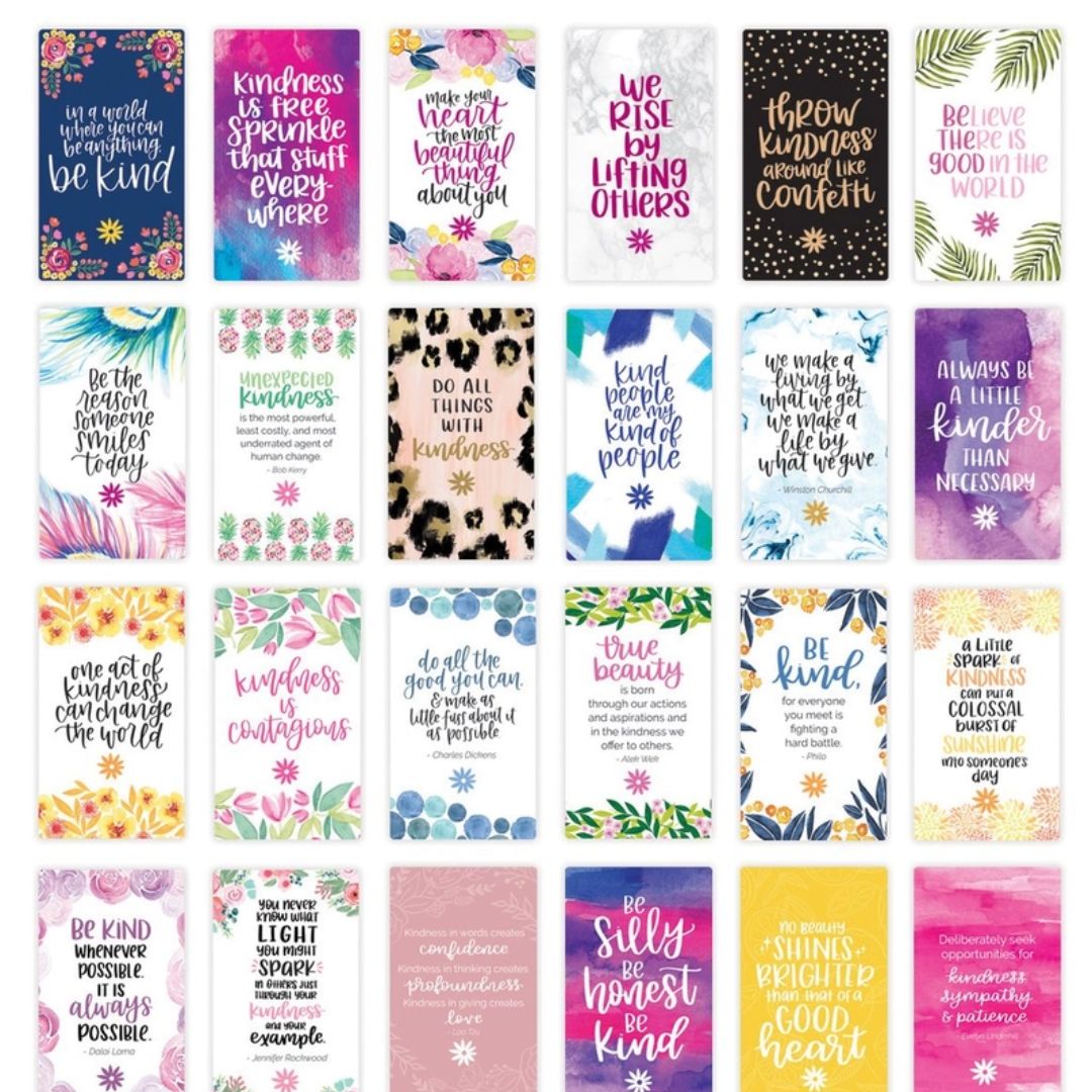 • Front of cards are glossy and feature a kindness-themed quote